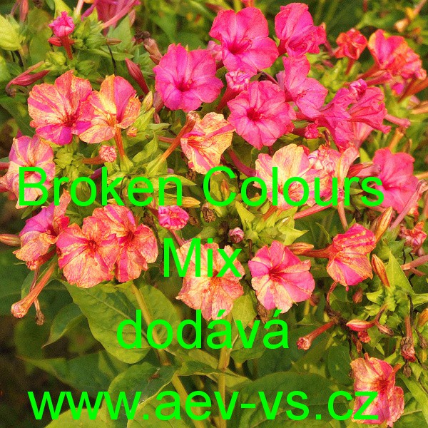 Popis: Nocenka jalapovitá, jalapenská, zahradní (Mirabilis jalapa) Broken Colours Mix je asi 60 až 80 centimetrů vysoká velkokvětá voňavá směs jednoletých květin. Vykvétá žíhanými květy. V mírných zimách přezimuje, je víceletá.